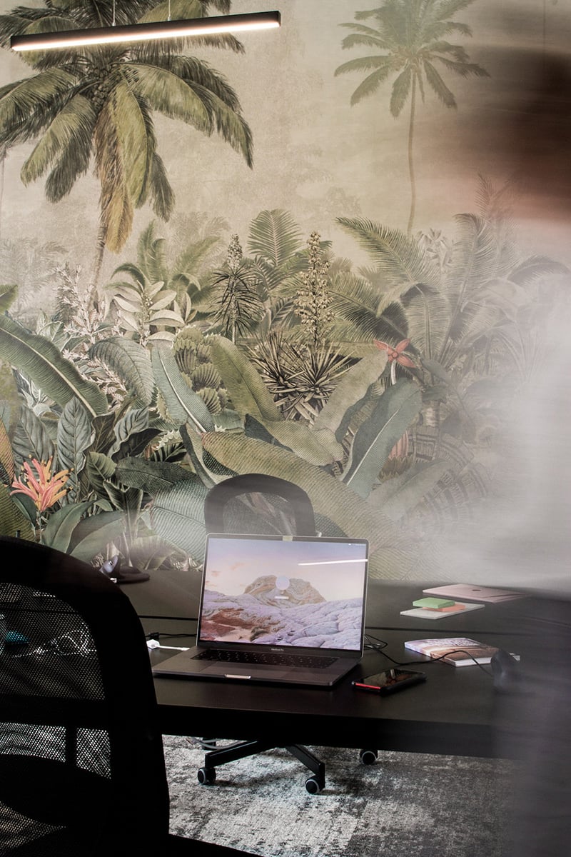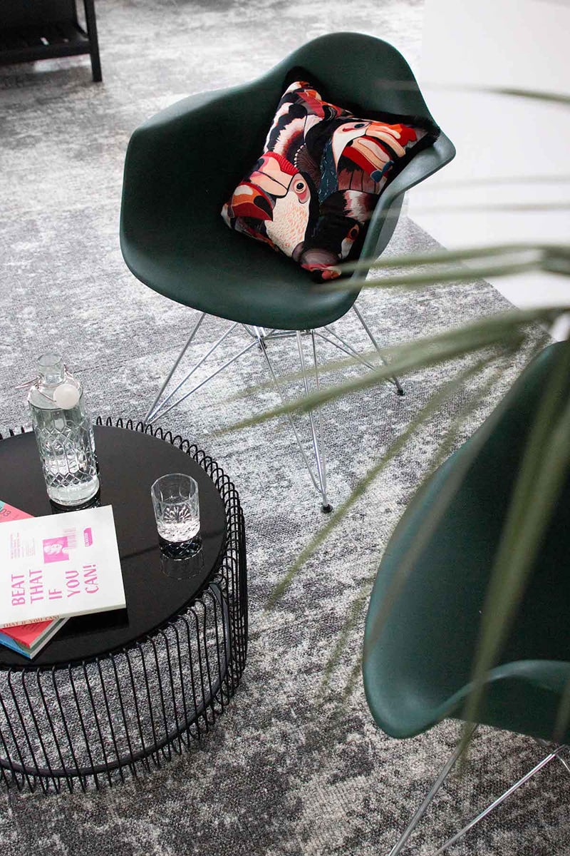 Multifunktionsraum: • 12 Arbeitstische inkl. Bürostühlen • Großer Meeting Tisch für bis zu 8 Personen • 5 Telefonboxen • Ein Hängesessel • Ein Strandkorb • Ein Stehtisch • Regale mit Inspiriationsmaterial • Lounge mit einem Sofa und vier Sesseln • Mittagstisch für bis zu 6 Personen • Garderobe • Drucker