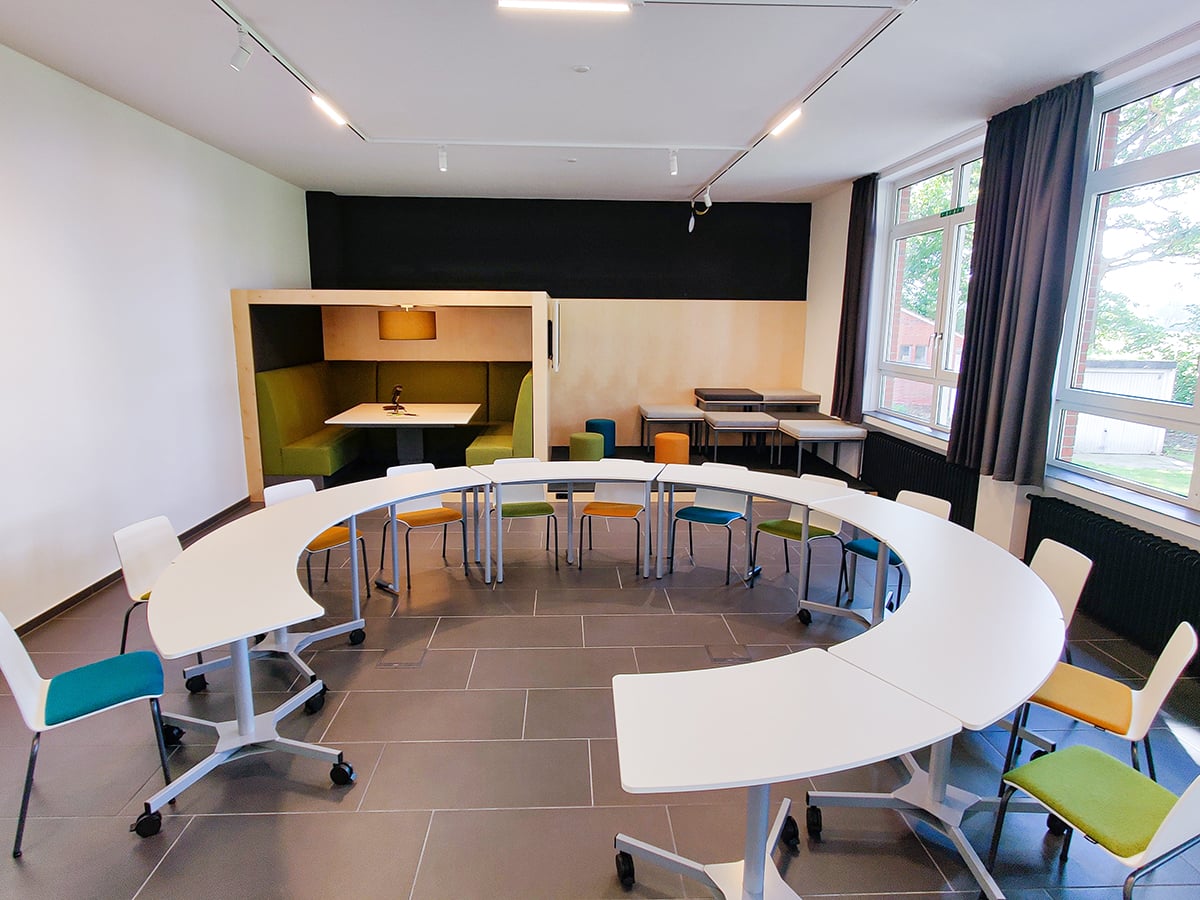 *Seminarraum 4.0* Unser Seminarraum 4.0 bietet sich perfekt für größere Workshops oder Veranstaltungen an. Die Tische sind z.T. höhenverstellbar und standardmäßig im Halbkreis aufgestellt. Die Tische können jedoch flexibel umgestellt werden. Im Raum befinden sich zwei digitale Whiteboards und ein normales Flipchart. Ein passender Moderationskoffer inkl. Stiften und Post-its sind im Raum hinterlegt, ebenso wie ein Mikrofon plus passender Verkabelung für die Podcastkabine. Sitzend an den Haupttischen bietet der Raum Platz für ca. 13 Personen. Aufgestockt werden kann dies durch die im Raum verfügbaren Sitzhocker sowie die Plätze in der Podcastkabine.