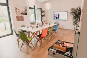 26,5 qm großer Konferenzraum mit hochwertigem vom Tischler angefertigten Konferenztisch, der aus 2 Elementen besteht. 8 bis max. 12 Plätze. Gartenzugang. Inkl. Flipchart, Monitor, 5m Magnetwand.