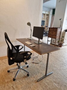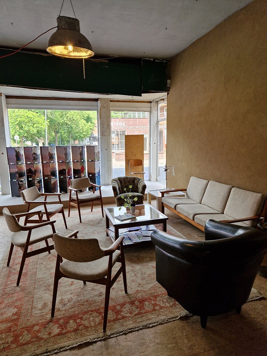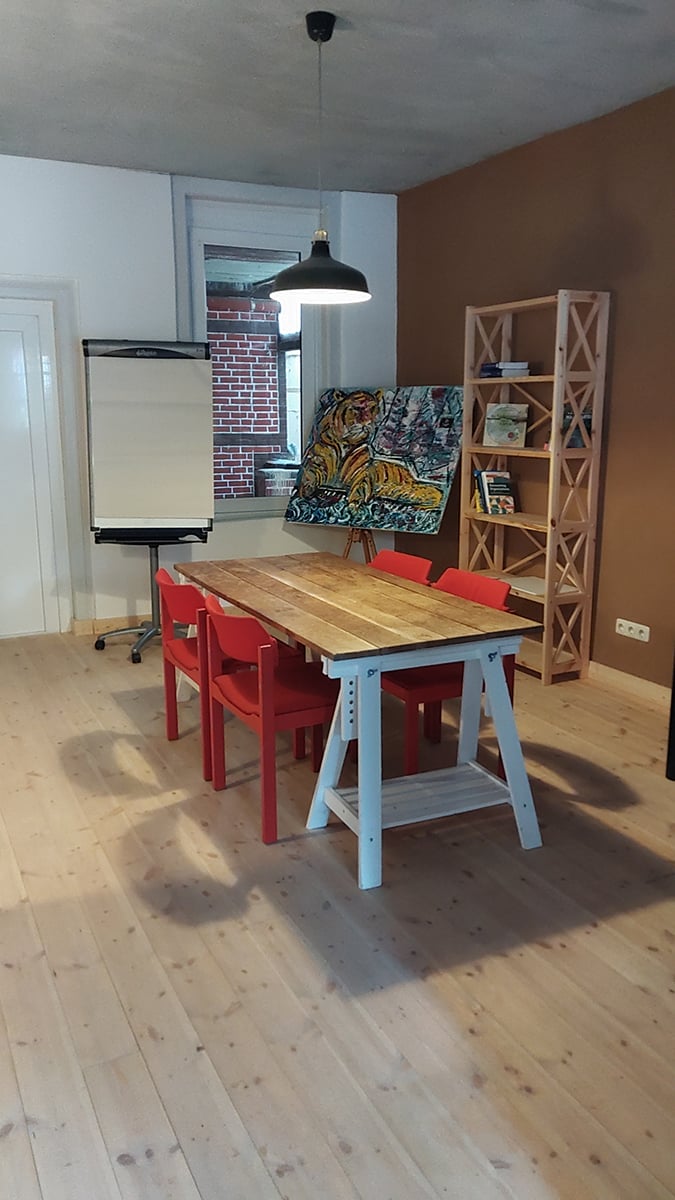Der Coworking-Space erstreckt sich über insgesamt 120 Quadratmeter. Er unterteilt sich in eine große luftige Bürofläche sowie kleinere Räume für Meetings und ungestörtes Arbeiten. Der große Raum kann auch flexibel für Veranstaltungen mit bis zu 80 Personen genutzt werden. Ein großes Schaufenster zu Straße hin bietet Möglichkeiten für Ausstellungen und kreative Projekte. Lounge-Bereich und Pantry sind im Entstehen, denn aktuell ist der Space noch in der Startphase. Erste Nutzer*innen sind jedoch bereits eingezogen und gestalten den Space mit.