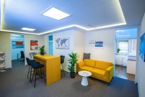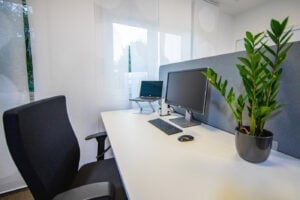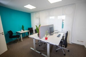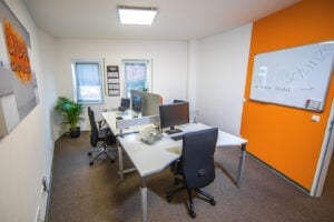 Alle Arbeitsplätze verfügen über Monitor, Tastatur, Maus und Docking Station. Die Schreibtische sind elektrisch höhenverstellbar, wodurch sie flexibel im Stehen oder sitzend genutzt werden können. Unser professionelles WLAN/LAN ist per Glasfaser erschlossen. Zudem steht euch ein Laserdrucker/Scanner zur Verfügung.