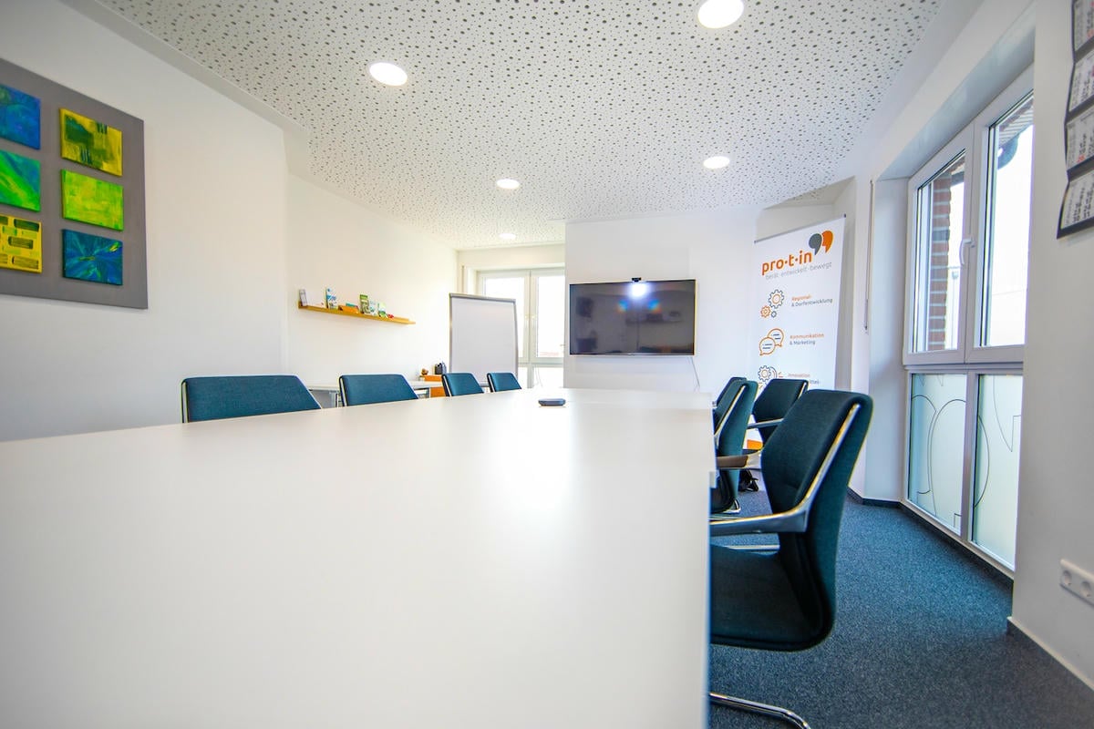 Meetingraum (1. OG) Optional buchbar, bis zu 10 Personen Tischbestuhlung, Flatscreen + Video-/Audioanlage für hybride Veranstaltungen, Flip Chart, Moderationswände