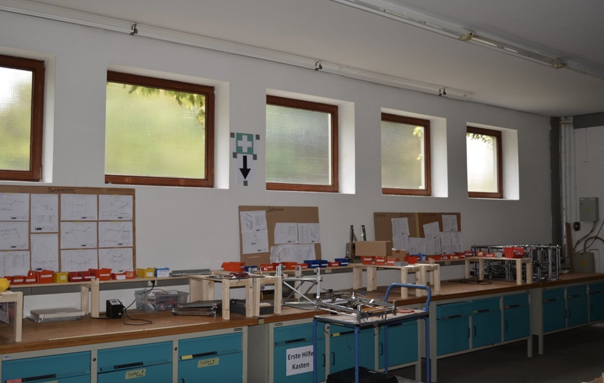 Voll ausgestattete Werkstatt mit Werkbänken und Werkzeug