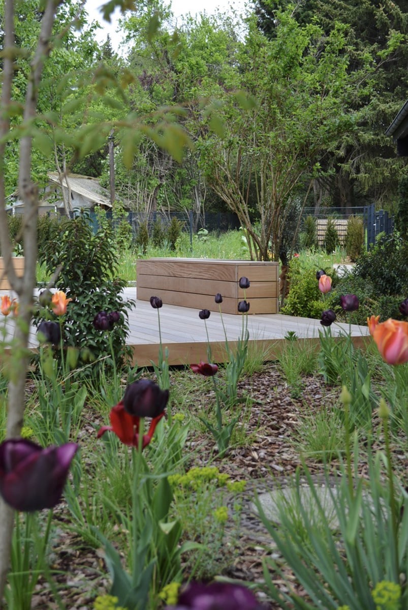 Große Terrasse mit Sitzgelegenheiten und Gartenanschluss