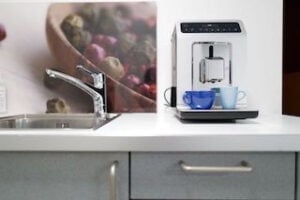 Voll eingerichtete Küche mit Mikrowelle, Kaffeemaschine, Wasserkocher, Wasser, FritzKola Getränken und vielen Sorten Tee.