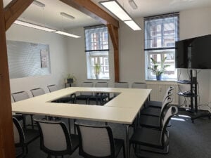 Der Besprechungsraum (nicht barrierefrei) bietet Platz für max. 16 Personen. Es sind dort 8 Doppeltische mit je 2 Stühlen vorhanden. Für die interaktive Arbeit stehen ein Flipchart, eine Magnetwand und eine Trennwand mit Pinoption zur Verfügung. Der Präsentations-Bildschirm kann über einen HDMI-Anschluss genutzt werden und ist mit einer Web-Cam inkl. Mikrophon verbunden.