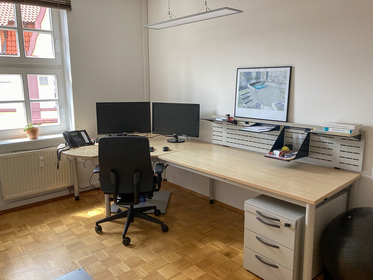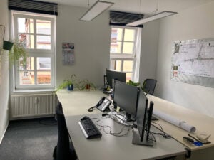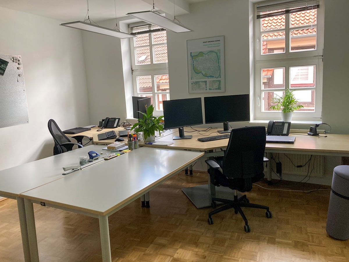 Das 1772 erbaute Fachwerkhaus wurde 1998 durchgehend saniert und 2021 wurden die einzelnen Büros noch einmal optimiert (Beleuchtung, höhenverstellbare Tische, etc.).