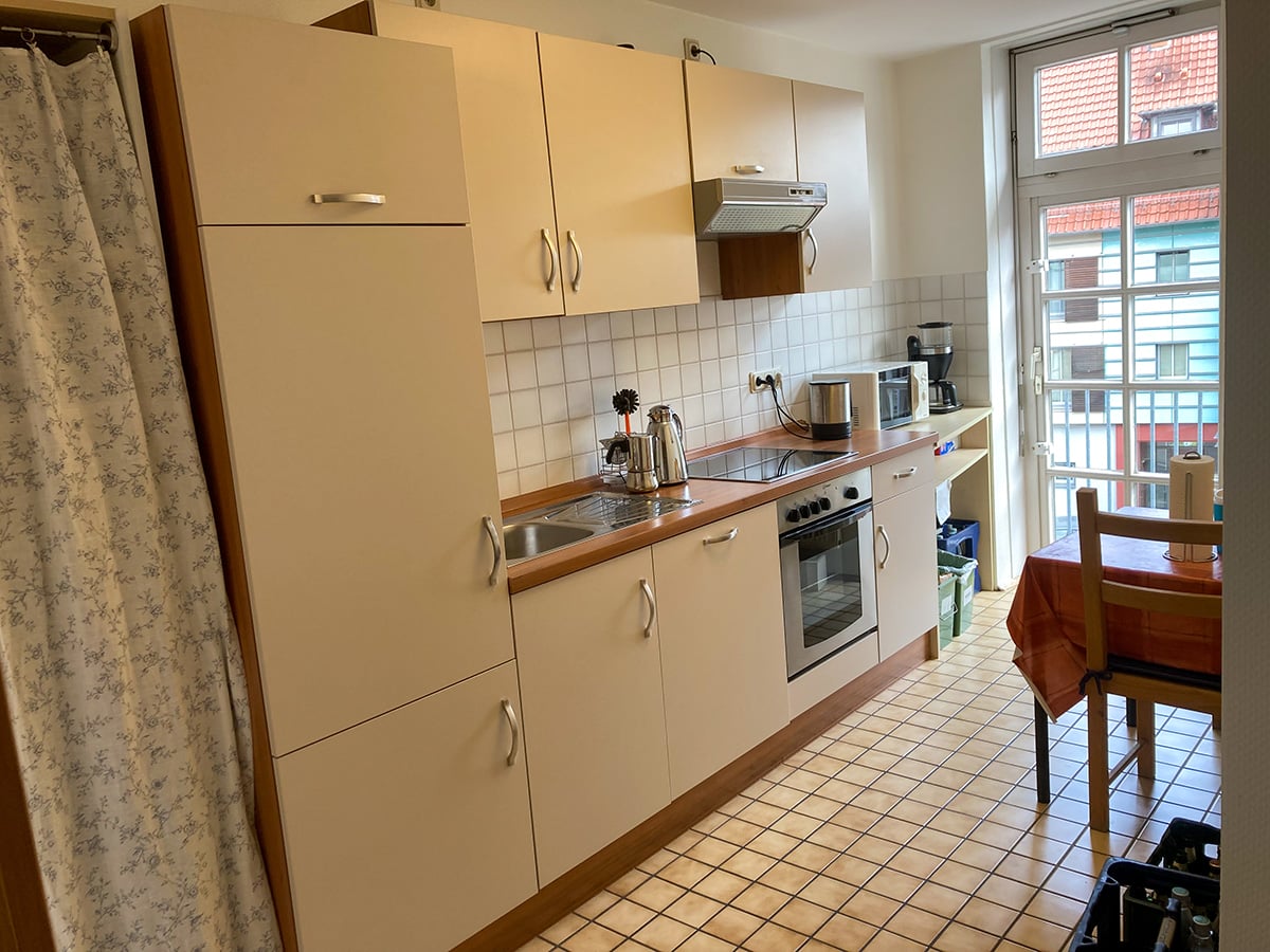 Voll eingerichtete Küche mit Herd, Backofen, Kühlschrank, Spülmaschine, Mikrowelle, Wasserkocher und Kaffeemaschine. Diese ist frei zugänglich. Getränke wie Wasser, Tee, Kaffee und Saftschorlen können gegen eine Spende entnommen werden.