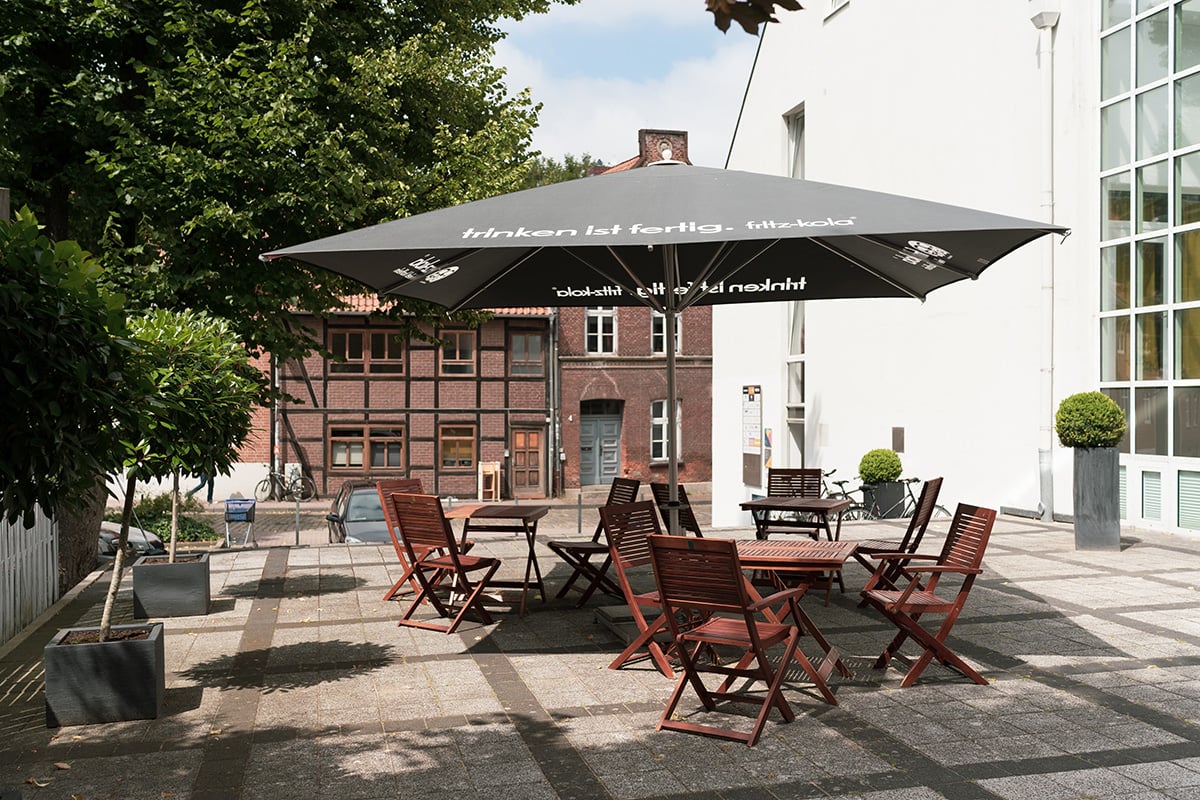 Terrasse: Hochbeete, Sitzgelegenheiten, Sonnenschirme, inkl. W-Lan und Stromanschlüssen