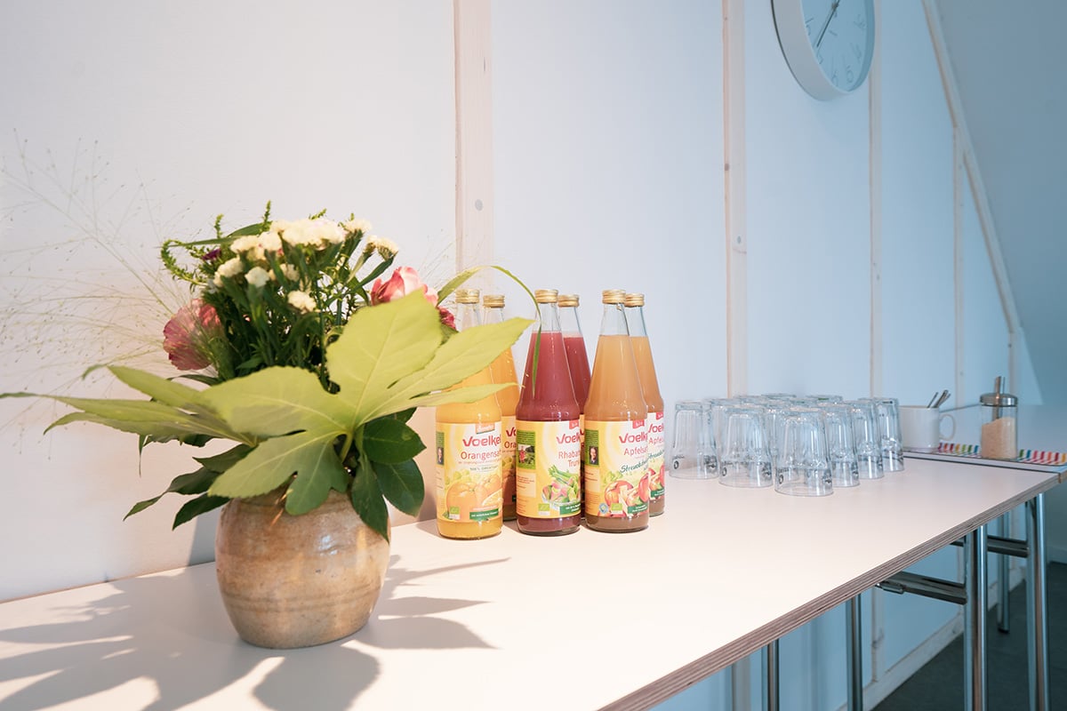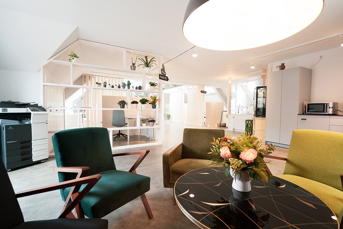 Veranstaltungsfläche bis 100 Teilnehmer*innen, Gemeinschaftsküche, Sofaecke, Schließfächer, Netzwerkdrucker, FlexDesks