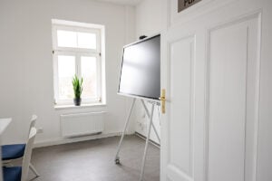 Flip Charts, Digitales Whiteboard, 3 mobile Besprechungstische für 10 Personen oder Reihenbestuhlung für 25 Personen