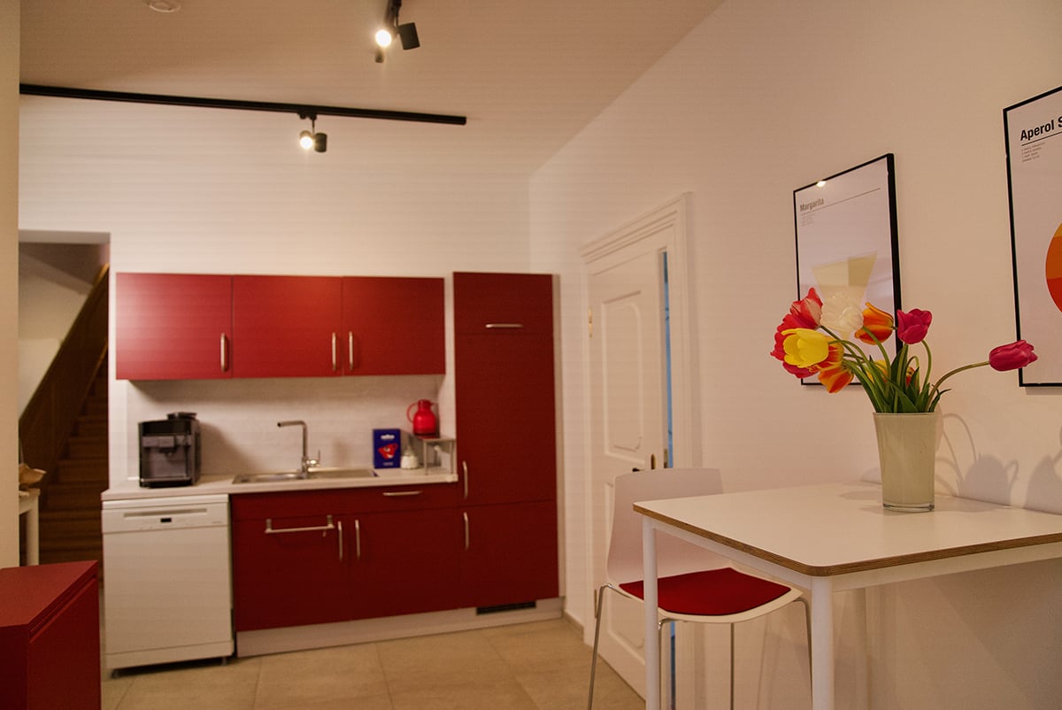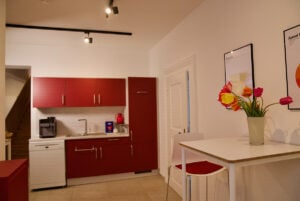 Küche mit Geschirrspülmaschine und Sitzplatz Aufenthaltsbereich im Flur mit langem Tisch für bis zu 8 Personen und Teeküche im EG