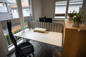 Derzeit bieten wir 14 Arbeitsplätze und einen Besprechungsraum (bis zu 5 Plätze) auf 160 m² an. Die Arbeitsplätze verteilen sich auf Flex Desks und Fix Desks sowie auf drei private Büros. Unsere Telefonbox dient als Rückzugsort für ungestörte Telefonate oder maximal konzentriertes Arbeiten.