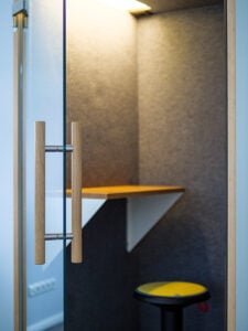 Unsere Telefonbox dient als Rückzugsort für ungestörte Telefonate oder maximal konzentriertes Arbeiten.