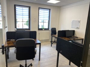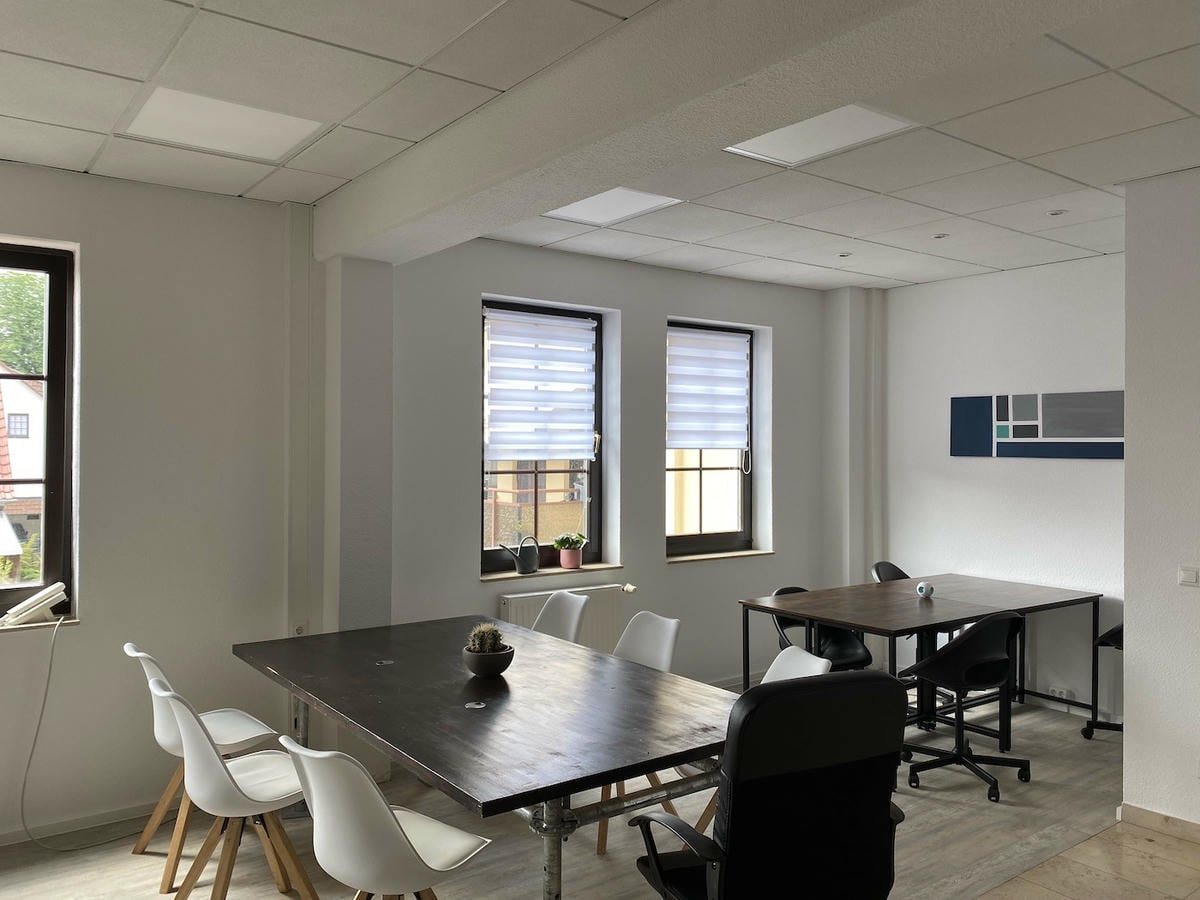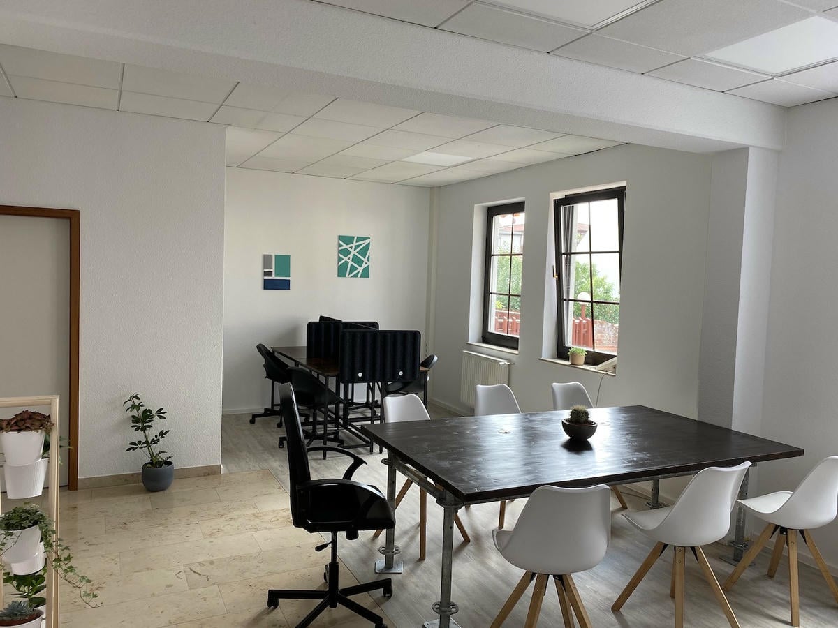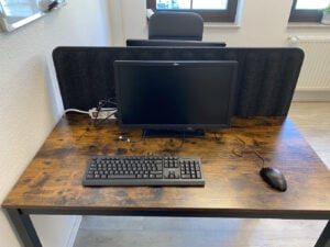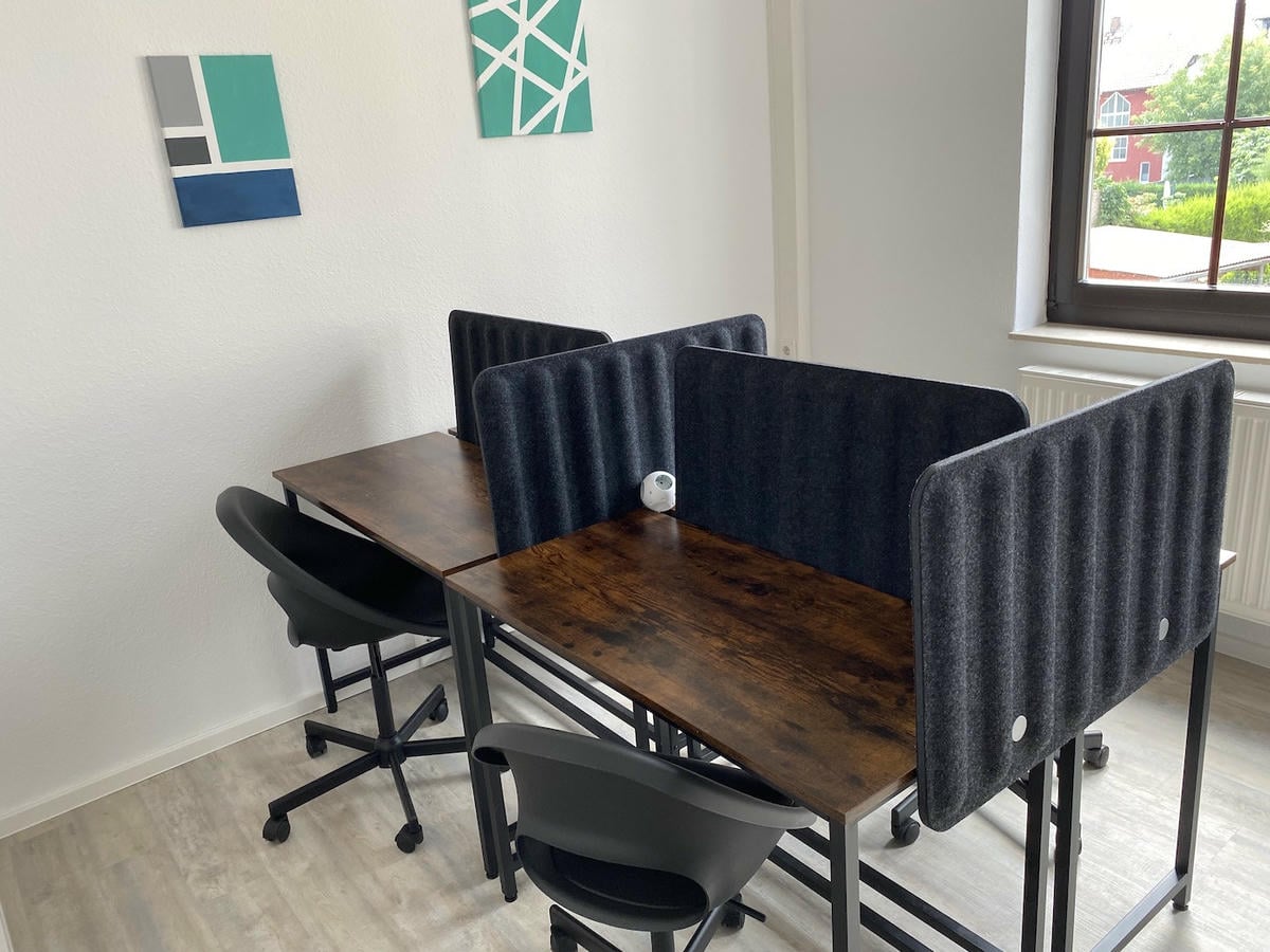 Shared-Desk-Bereich mit 12 Sitzplätzen, davon 4 mit Schallschutzwänden, Sitzecke – Freie Platzwahl – Tagesnutzung nach Online-Anmeldung – Kostenloses Drucken und Scannen (fair use) – inklusive Tomatensaft