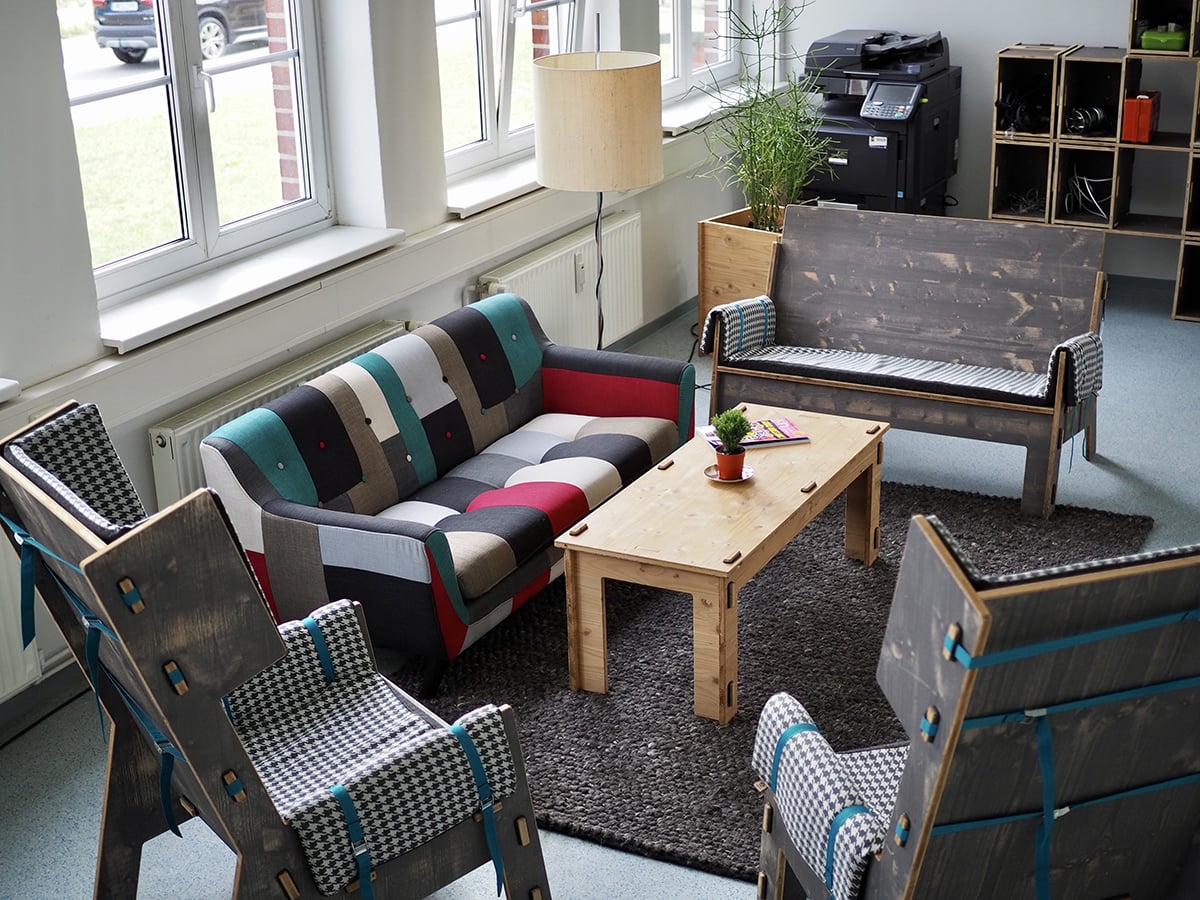 Arbeitsplätze, gemütliche Sitzgruppe, W-Lan und Garderobe