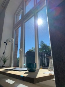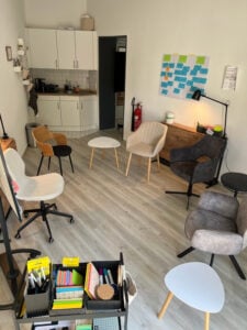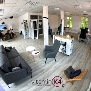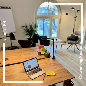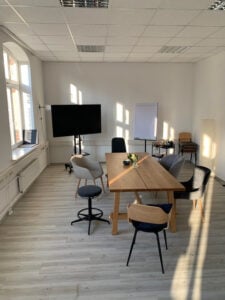 Großer Space (1. OG) – langer Tisch mit 8-10 Plätzen – 2 Plätze Stehtisch Fenster – Sofa und mehrere Sessel mit Beistelltischen – 3 Schreibtische – Hängematte – Schließfächer – Flipchart, Moderationsmaterial, 65’’- Monitor auf Monitorrollwagen – Drucker (nach Rücksprache
