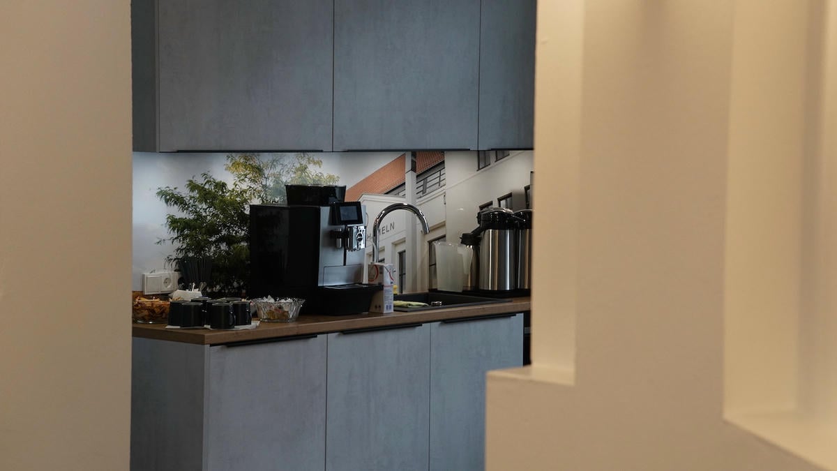 Teeküche (OG) mit Ofen und Mikrowelle, Kühlschrank, Wasserhahn mit Kohlensäure