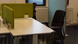 Offene Coworking Area mit zehn höhenverstellbaren Tischen und einer Eckzeile mit sechs Kurzzeitarbeitsplätze