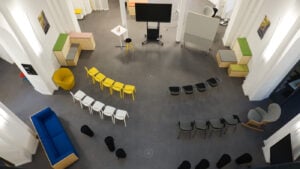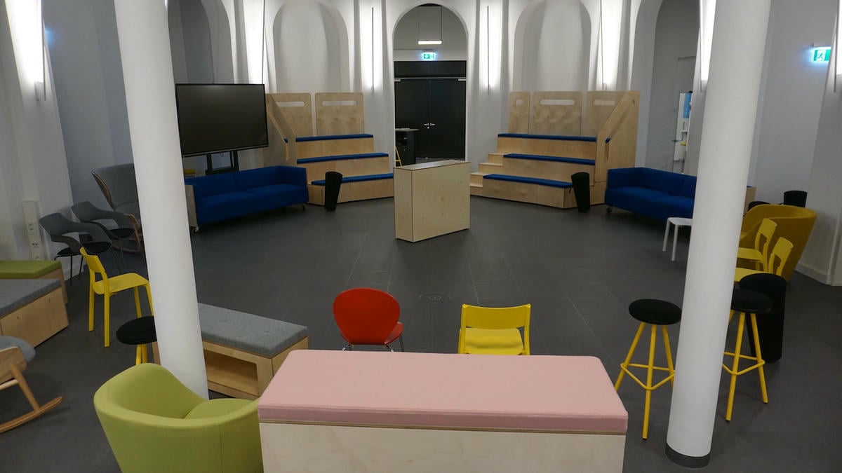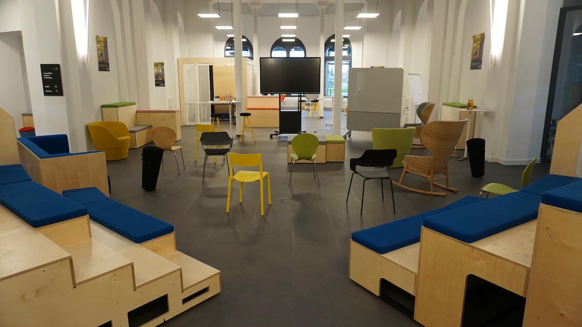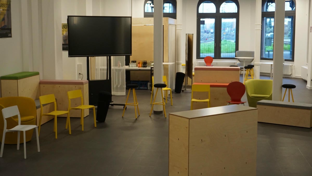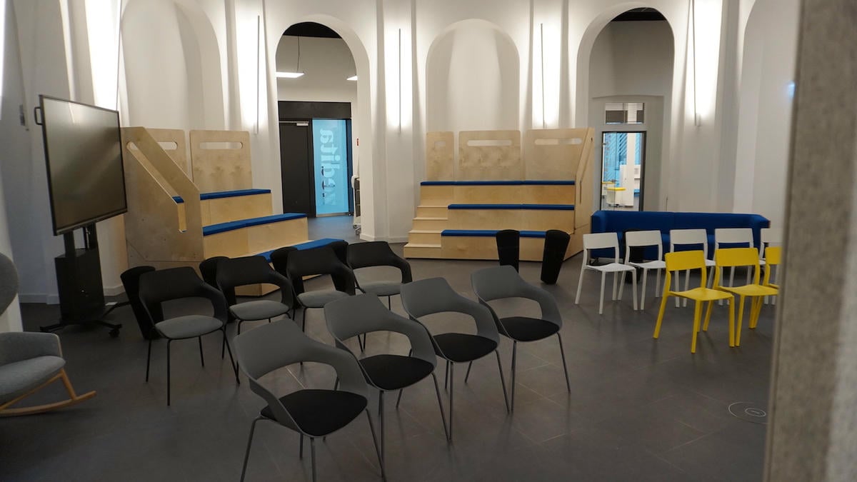 200 qm Event Space (für maximal 175 Personen) mit Tribüne, flexiblen Sitzmöbeln, Flipcharts, Whiteboards, Schaukelstühlen & Seelen.