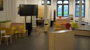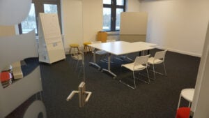 Drei Workshop-Räume zwischen 30-55 qm mit Monitoren, Stühlen, Tischen, Flipcharts etc.